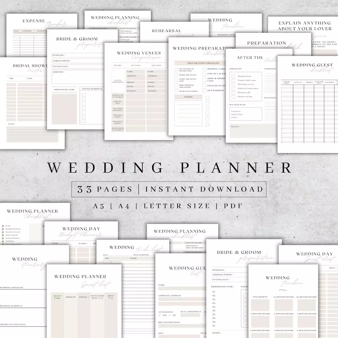 This is a printable WEDDING planner to manage your wedding budget, itinerary, and timeline. It easily helps to achieve the biggest couple and wedding day goals in just a few steps. Organizing this perfect day and creating checklists is the first, big step to leading a successful and happy wedding experience. This minimalist planner will help you get organized and get the most out of your expensive time.